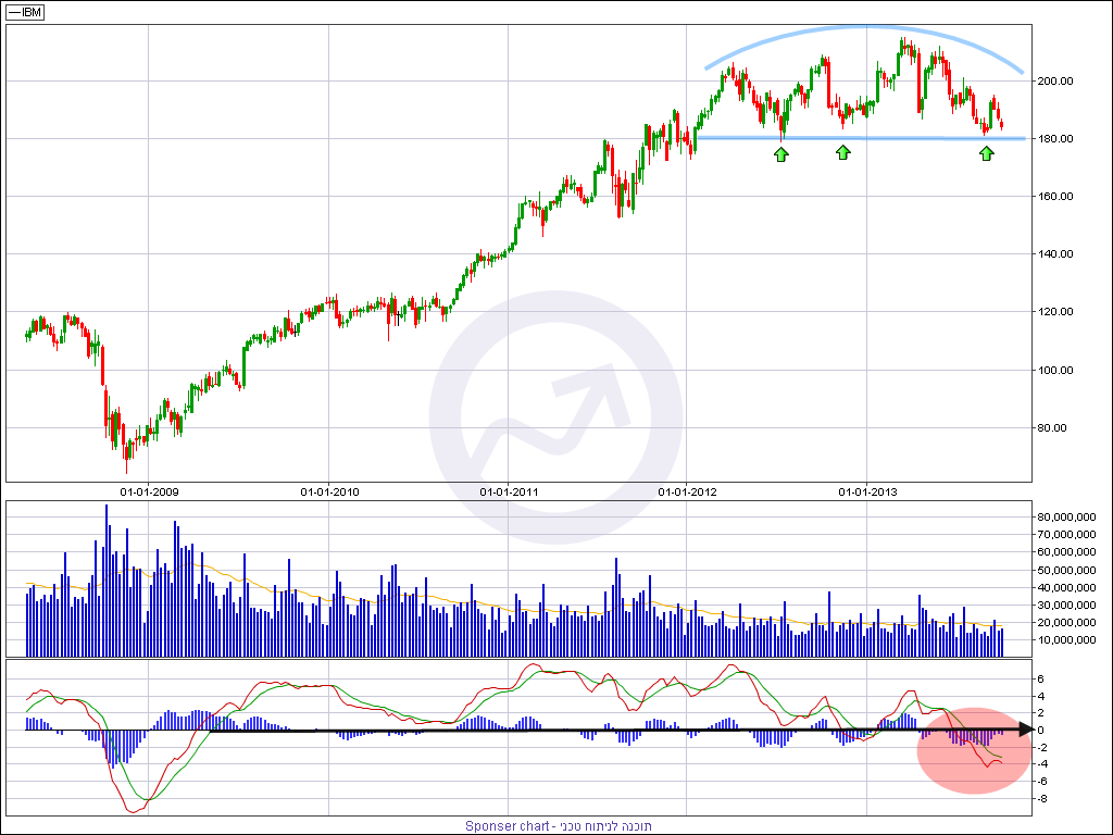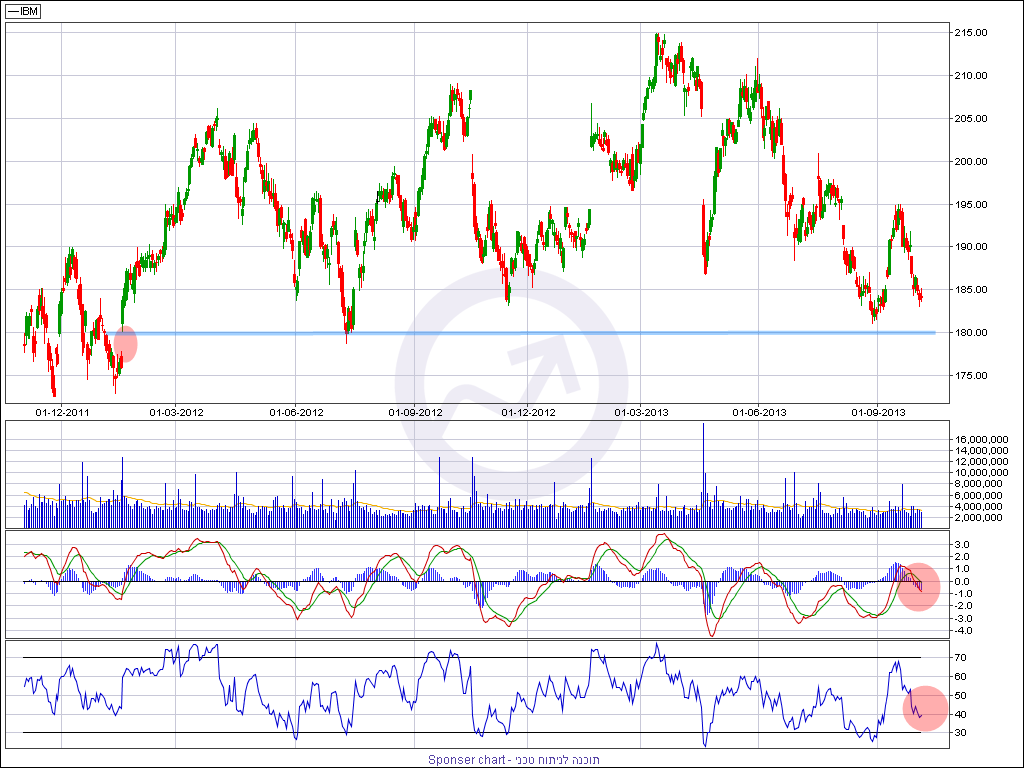 ניתוח טכני – מניית IBM נסחרת בשנה וחצי האחרונות בתנועה אופקית ברורה בין אזור של 180 דולר למניה לרמות שיא כל הזמנים 208-213 דולר למניה. התצורה הטכנית בחודשים האחרונים אינה נראת טוב על הגרף ודומה לסוג של פסגה רב שנתית שנבנית בשנה וחצי האחרונות. רמת 213 דולר מסמנת את שיא הפסגה שמגיעה לאחר מהלך עליות חזק מאוד מרמות של פחות מ 80 דולר בשנת 2009 ועד לשיא שצוין לעיל. גם האינדיקטורים הטכניים בגרף השבועי שליליים וניתן לראות את הירידה של מתנד ה- MACD מתחת לטריטוריה החיובית עם חצייה שלילית של הממוצעים.