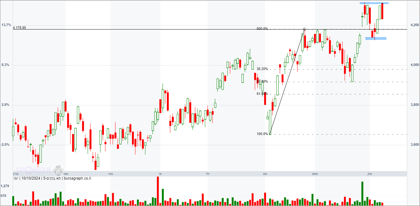 גם השבוע מדד הבנקים המשיך לזחול למעלה כשהוא מתקשה סביב רמת 1240 נקודות בטווח הקצר. הנחת העבודה של המשקיעים צריכה להיות ברורה, כל עוד המדד מעל 1195/1200 היעד העולה הינו לאזור של 1300 נקודות, היעד נגזר מגובה הדשדוש של החודשים האחרונים כשהמדד נעל בין 1100-1200 נקודות. רק ירידה מ 1180 ונעילה שבועית מתחתיו תערער את היעד שלנו.