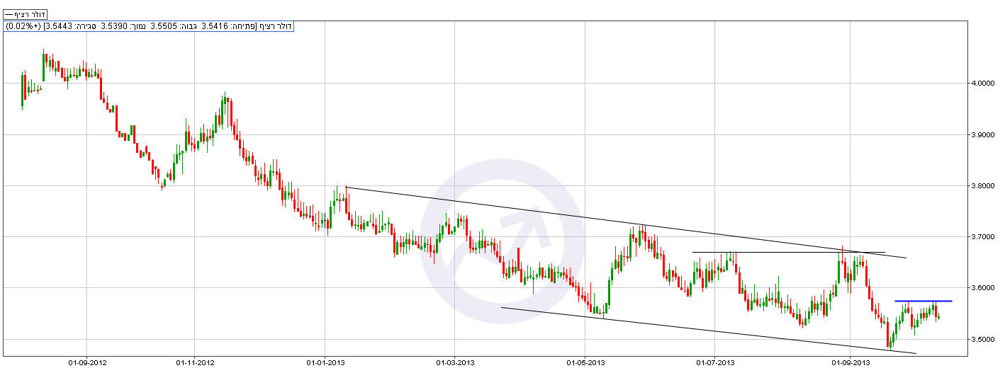 המטבע האמריקאי נותר כמעט ללא שינוי במהלך השבוע החולף ונסחר היום (שישי) ברמה של 3.54 ש"ח לדולר. המסחר בוול סטריט (חמישי) נחתם בעליות שערים חדות במדדים המובילים, על רקע אופטימיות של הפעילים בנוגע לפגישה בין הנשיא ברק אובמה לראשי המפלגה הרפובליקנית, שנערכה לאחר המסחר, ולא הניבה לעת עתה תוצאות משמעותיות. אתמול (חמישי) פורסמו נתוני הדרישות הראשוניות לדמי אבטלה לשבוע שעבר אשר עמדו על 374 אלף דרישות חדשות. הצפי בשוק היה לקריאה של 307 אלף דרישות, זאת לעומת 308 אלף דרישות שנרשמו בשבוע הקודם. מהבחינה הטכנית, ניתן לראות בגרף המצורף שהדולר מדשדש כבר תקופה ארוכה, ונמצא בתעלת מחירים יורדת, כשהתמיכה הקרובה נמצאת כאמור באזור 3.50 ש"ח לדולר, וההתנגדות הקרובה נמצאת ברמה של 3.57 ש"ח לדולר.