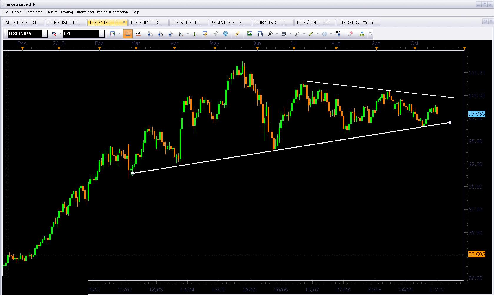 הדולר-ין עדיין בתוך משולש: הדולר-ין ממשיך לנוע בתוך משולש הולך ומתכנס. מצד אחד, ניתן לשרטט סדרה של שיאים יורדים מהפסגה של מאי ב-103.7, ומצד שני ניתן לראות סדרה של תחתיות עולות מפברואר, וזה בעצם טיבו של משולש, המלמד על לחצים מאוזנים משני הכיוונים. כרגע גבולות המשולש הן בין 97 ל-99.8, ורק כאשר נראה פריצה משכנעת של אחת הצלעות נוכל להעריך את המהלך הבא של הצמד.