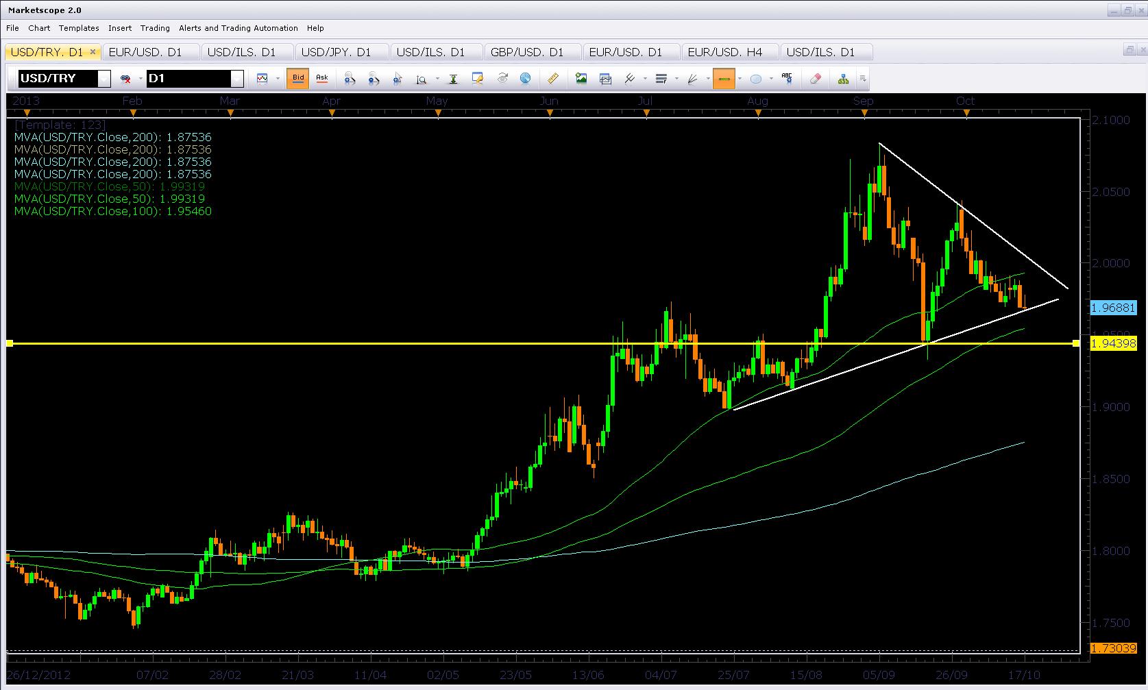 הלירה הטורקית מנסה לשבור את הדולר: בגזרת המטבעות האקזוטיים, מעניין לבחון את הלירה הטורקית למול הדולר. לאחר שלירה הטורקית צנחה בספטמבר לשפל רב-שנים (שיא של ה-USDTRY) ב-2.01, הצמד החל לתקן בחוזקה כלפי מטה, וכעת, על רקע הגל האנטי-דולר, הצמד עומד לשבור מתחת לקו העולה המחבר את התחתיות המשמעותיות מאז יולי. שבירה מתחת לקו זה תחשוף את ה-SMA ל-100 יום ב-1.95 ולאחר מכן את רמת הציר האופקית ב-1.943.
