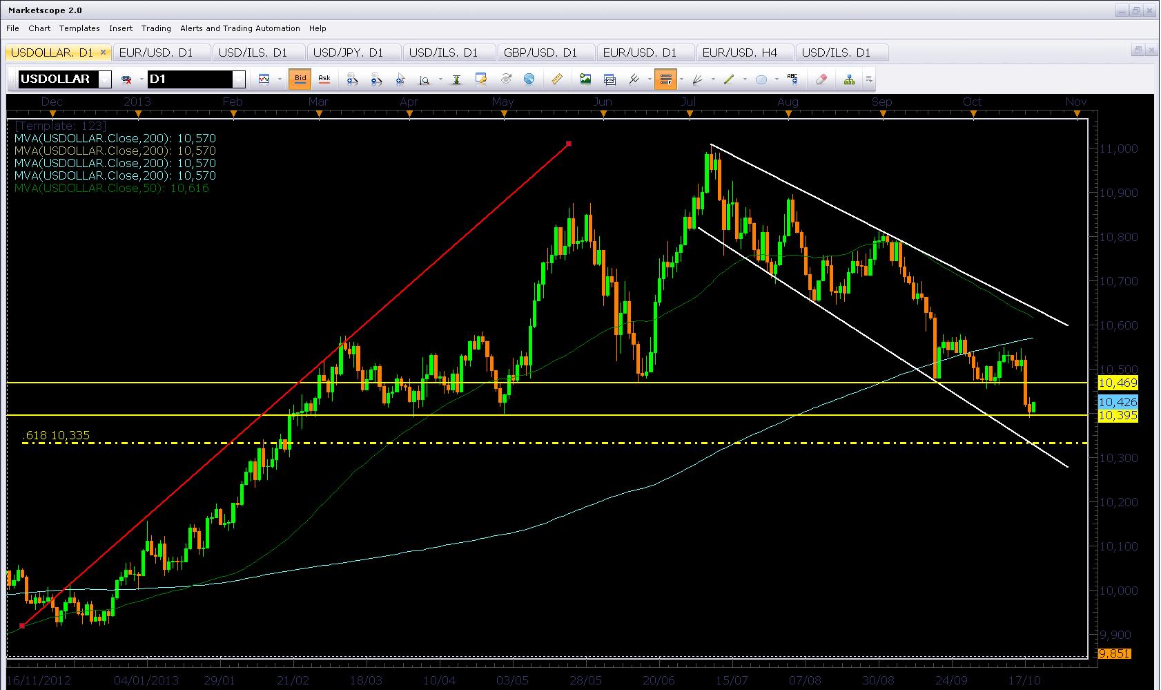 הנכס המרכזי שיושפע מהפרסום היום הוא הדולר. בגרף של מדד הדולר של FXCM (הבוחן את ערכו של השטר הירוק למול סל של מטבעות מרכזיים), ניתן לראות שהדולר מצוי בירידה חדה מאז חודש יולי. לא מכבר שבר המדד מתחת לשפל של יוני ב-10,467 והמשיך לצנוח במורד התעלה. בתחילת השבוע מצא המדד תמיכה בקו הציר המקביל לשפל של אפריל ב-10,394 ואף מציג תבנית אפשרית של "שורי בולע", העשויה לאותת על מפנה. רק עלייה חזרה מעל 10,467 עשויה לתת למדד דחיפה לתיקון רחב יותר. מנגד, שבירה מתחת ל-10,394 תצניח את המדד לעבר נסיגת פיבונאצ’י 61.8% של העלייה הגדולה מנובמבר 2012 ועד יולי 2013, ב-10,333.