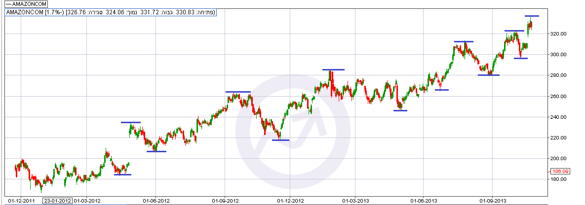 כפי שניתן לראות בגרף היומי המצורף, מניית אמזון נמצאת במגמה עולה ברורה מזה כשנתיים, כל פסגה גבוהה יותר מקודמתה, וכל תחתית נעצרה עד כה גבוה יותר מהקודמת לה. כל עוד מגמה זו נמשכת המניה צפויה להמשיך ולעלות בשבועות הקרובים, אלא אם כן יהיה טריגר מפתיע ושלילי (דו"חות הרבעון השלישי או התחזיות להמשך). כרגע, אלו שמחזיקים במניה צריכים להפעיל סטופ לוס רק במידה והמניה סוגרת בצורה ברורה מתחת לאזור 300$. מנגד, פריצה של רמת 330$ תהווה איתות קניה מחודש.