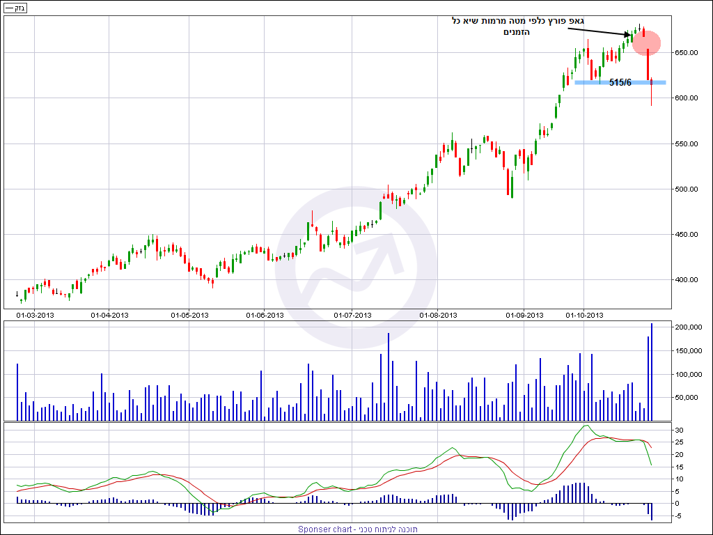 ניתוח טכני – במהלך שבוע המסחר שחלף, התממשה המניה בחדות עם יציאה בגאפ יורד חזק מאוד מרמות שיא כל הזמנים סביב 670+ נקודות. סיטי בנק הוריד את המלצתו על המניה ל-"מכירה" אשר שלחה את המניה לירידות שערים חדות בליווי מחזורי מסחר ערים במיוחד. ביום המסחר האחרון (חמישי) ראינו המשך מימושים אולם נעילה בירידות קלות באופן מהותי סביב הנמוך האחרון ברמה של 615 נקודות. טכנית הגאפ היורד והירידה מתחת לשיא כל הזמנים הקודם (630) הינם איתות אזהרה ראשון ומהותי. בשלב זה, סביר שנראה רמות נמוכות יותר בתקופה הקרובה. חזרה מעל 630/5 נקודות יכולה לערער את הנחת העבודה לטווח הקצר.