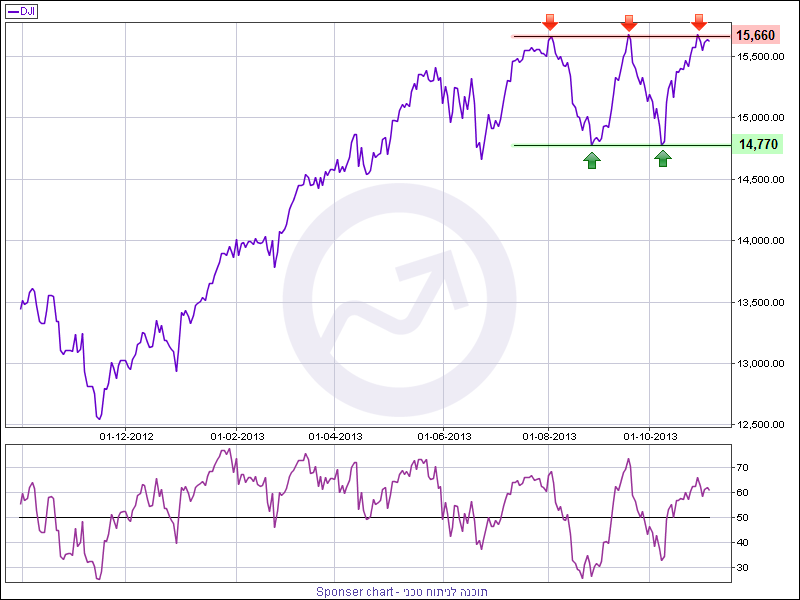 מדד הדאו מהווה ברומטר לשוק המניות האמריקאי והקושי לייצר שיא משמעותי מגדילים את האפשרות ששוק המניות לקראת מיצוי מהלך – בגל הנוכחי. רק סגירה והתבססות מעל רף ה- 15,700 נקודות תאותת על המשך קיומה של המגמה החיובית בשוק המניות האמריקאי בעוד שמימוש בנקודת הזמן הנוכחית תשדר חולשה אשר ככל הנראה תוציא את המדדים המובילים לתיקון יורד.