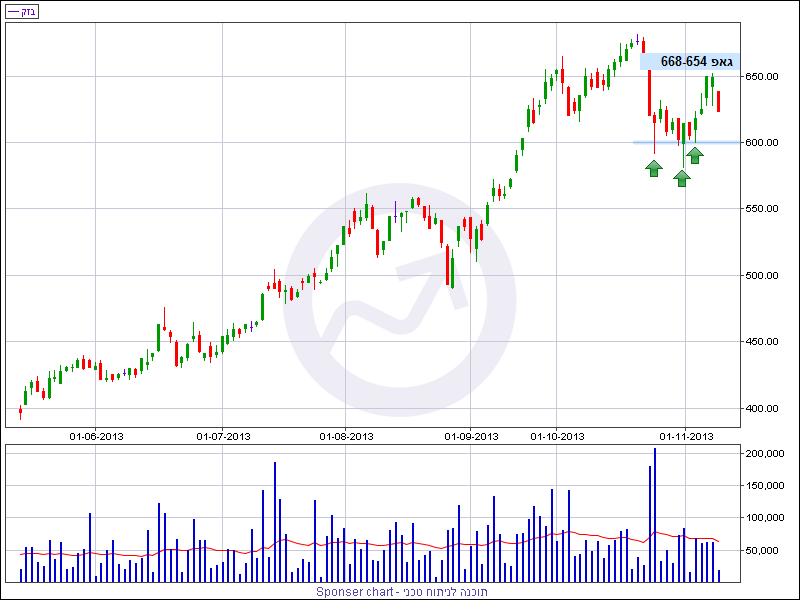ניתוח טכני – המניה נכשלה בשבוע שעבר לפרוץ חזרה אל מעל רף ה- 650 נקודות והיום (א’) המניה יורדת בכ- 3.5% (נכון לזמן הכתיבה). המגמה עדיין חיובית, אולם בטווח הקצר יתכן והמניה תבדוק פעם נוספת את רמת התמיכה החשבה סביב 600 נקודות (במונחי שער סגירה). קיים גאפ פתוח בטווח 654-667 שטרם נסגר ובפועל הרף העליון ב- 667 עשוי להוות התנגדות נקודתית ורף ה- 678 נקודות – הגבוה השנתי.