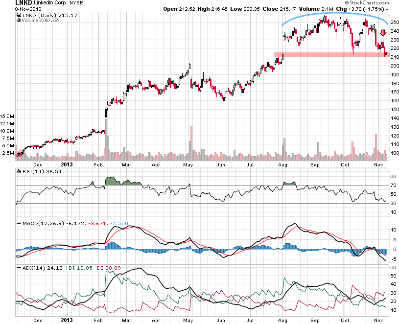 חברת לינקדאין (סימול: LNKD) הינה רשת חברתית המקצועית הגדולה ביותר בעולם. מטרת הרשת ליצור קשרי נטוורקינג בעיקר בעולם העסקי. החברה נסחרת בבורסת NYSE בשווי שוק של 25.7 מיליארד דולר. בסוף אוקטובר דיווחה החברה את דוחותיה לרבעון השלישי בו דיווח על רווח של 0 סנט למניה בעוד צפי האנליסטים עמד על 0.01 סנט למניה. עוד נתון מעניין הוא שחברה הונפקה באמצע שנת 2011 ומאז ועד היום לפני המסחר עלו מניות החברה מעל 130%.