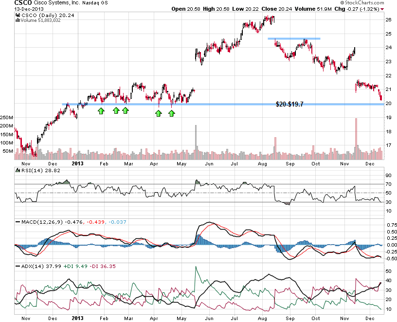 בסקירה הקודמת שלי על המניה בסוף ספטמבר ציינתי שהמניה לקראת הכרעה לטווח הקצר. הנחת העבודה שלי שהמניה לא תחזיק מעל האזור התמיכה והיא תגיע לאזורים של 20-21 דולר, מה שקרה בפועל בימים אלה. ניתן לראות שאזור התמיכה סביב 20 דולר מתקרב, זהו לא רק אזור תמיכה מהותי אלא גם אזור בו החלה המניה את שנת 2013. למעשה, שנה חיובית מאוד בשוק המניות פסחה על מניית סיסקו ולמרות שנסחרה ברמות גבוהות יותר בחודשים יוני-אוגוסט דאגה החברה לעשות ביצועי חסר ביחס למדדים המובילים ולמחוק את רוב העליות מתחילת השנה.