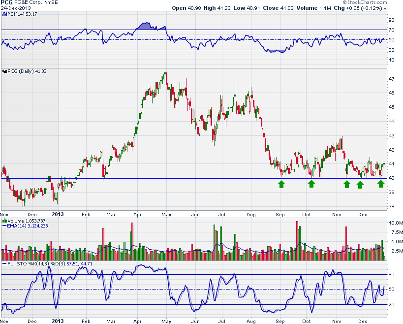 מניית PCG נסחרת מספר חודשים מעל רמת תמיכה אופקית חשובה ברמה של 40 דולר, אולם טרם יצאה למגמה עולה. הניסיון האחרון נכשל לאחר שנבלמה ברמה של 43 דולר. בשלב זה קיימת אפשרות ליציאתו של גל עולה נוסף עם מחיר יעד ברמה של 43 דולר. במידה ורמה זו תיפרץ כלפי מעלה, תביא לסלילת הדרך חזרה לאזור 45.50-46 דולר.