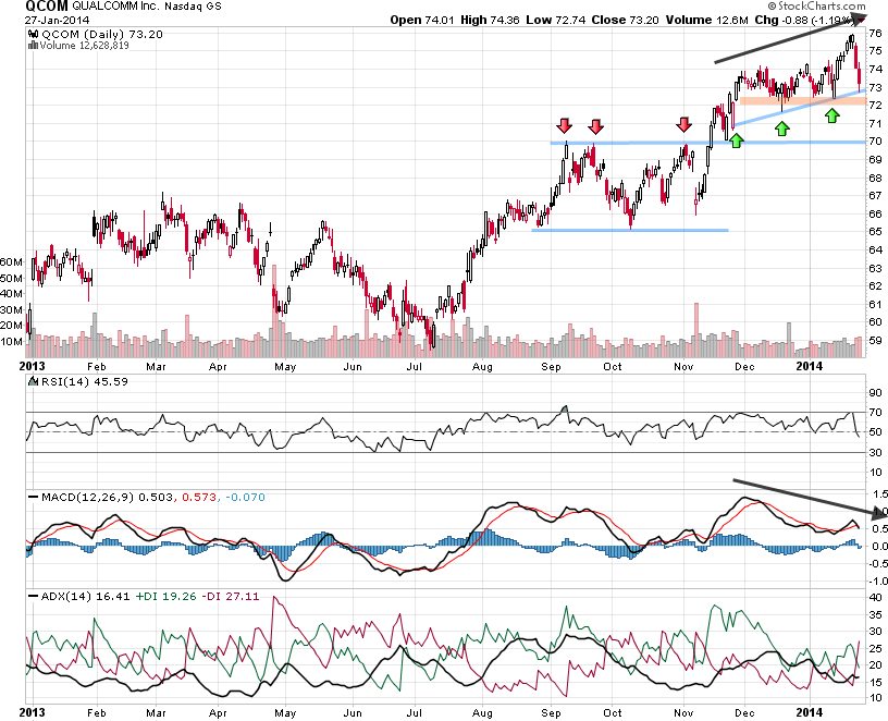 אמש, נבלמה המניה מעל קו מגמה עולה בטווח הקצר, שבירתו יחד עם שבירת השפל האחרון סביב 72 דולר יעידו על המצאות מוכרים סביב הרמות האלה. תמיכה חשובה יותר קיימת בגבוהים האחרונים של ספטמבר ונובמבר שהביאו למהלך העולה עד ל מות השיא הרב שנתיות והיא שוכנת סביב 70 דולר שהיא לא רק רמת תמיכה פוטנציאלית בגרף אלא רמת מחיר עגולה. נעילה מתחת ל 70 יכולה להביא לתיקון מעט עמוק יותר במניה.
