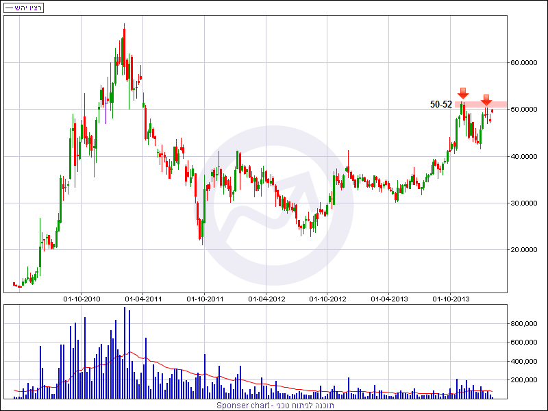 המניה נסחרת היום בעליה של כ- 4%. מוקדם יותר המניה עלתה ב- 5% ונסחרה על רמה של 50 אג’. אזור 50 אג’ מהווה אזור התנגדות אשר בלם את גל העליות מתחילת חודש ינואר, זאת בפעם השלישית בעוד שרף ה- 52 אג’ סימל את השער הגבוה של גל העליות המרשים שיצא לדרך בחודש מאי 2013. מנתונים אלו ניתן להסיק שאזור 50-52 מהווה התנגדות נקודתית.