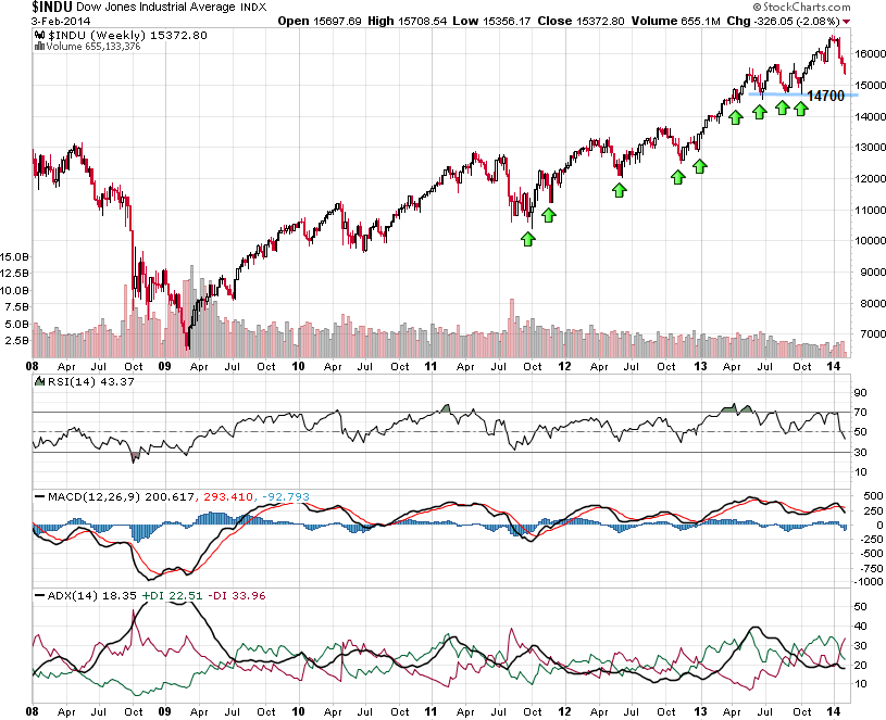 בגרף הרב שנתי המדד נמצא בטרנד עולה ברור עם שיאים ושפלים עולים באופן מסודר מהרבעון האחרון של שנת 2011 ועד לכתיבת שורות אלה. גם התיקון היורד האחרון שנראה חד מאוד בטווח הקצר הינו תיקון בריא מאוד למהלך העולה האחרון. ניתן לראות בגרף השבועי לא מעט תיקונים עמוקים במדד באמצע שנת 2012, במאי יוני 2013 וביולי אוגוסט 2013. מכאן ניתן להסיק שבטווח הארוך כל עוד המדד נמצא מעל רצועת תמיכה של 14500/800 נקודות אין מה להתרגש יתר על המידה ומחזיקי הפוזיציות ארוכות הטווח צריכים להבין שעת תיקון הגיעה.