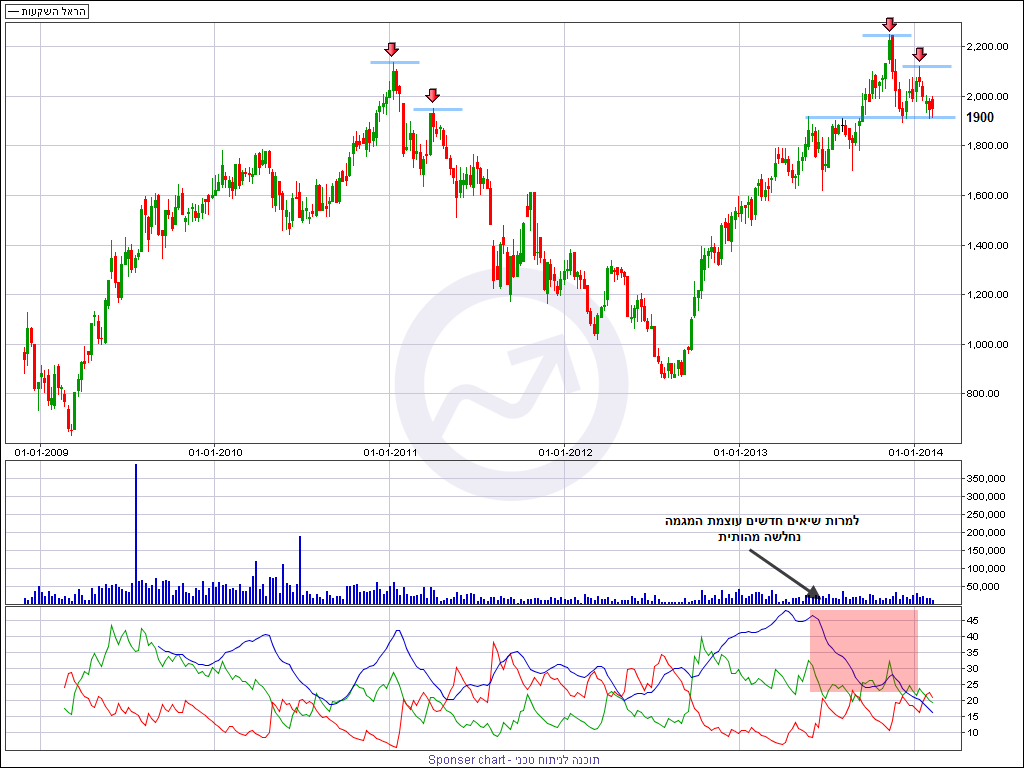 בגרף השבועי אנו רואים תמונה זהה מאוד לתקופה המקבילה לפני כ 3 שנים. החברה יצרה פיק עולה ולאחר מכן עשתה תיקון ויצירת שיא יורד על הגרף שהיה כהכנה לגל יורד חזק מאוד. גם אינדיקטור ה DMI המודד את עוצמת המגמה (קו כחול) מראה שלמרות הגבוה האחרון של נובמבר 2013 עוצמה במגמה למעשה כבר לא קיימת וזהו איתות אזהרה ראשון למחזיקים לא רק מהגרף עצמו אלא מהאחד האינדיקטורים היותר אמינים שקיימים.