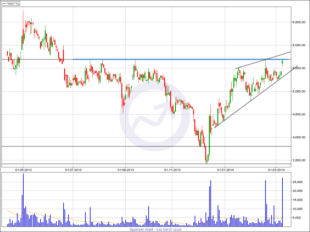 טכנית, ההודעות האחרונות של החברה השפיעו גם על מחיר המניה שנסחרת ברמות הגבוהות ביותר של החצי השנה האחרונה וסמוך לאזור התנגדות לא פשוט סביב 5700 נקודות. הבעת האמון של ילין לפידות שהוא הטריגר לגאפ העולה של יום המסחר הקודם הביאה דחיפה חזקה קדימה ונעילה סמוך לאזור התנגדות שצוין לעיל. נעילה מעל אזור של 5700 תהיה חיובית מאוד לטווח הקצר וגוזרת יעד עולה מהיר לכיוון 6100 נקודות בשלב ראשון שאני מעריך שגם יגיע בימים הקרובים ויעד ארוך יותר לאזור 6900 נקודות שהוא המהותי יותר. יחד עם זאת נציין קו התנגדות אלכסוני סביב רמת מחיר של 5820 נקודות שאמינותו נמוכה אולם יכול להביא לבלימה במחיר ולכן חשוב לשים אליו לב. מלמטה, קיים קו המגמה העולה שתומך במגמה של הנייר וגם מימוש אם יגיע בשלב מסוים, אם זה בחסות אווירה שלילית כללית בשוק אמור לתמוך סביב 5400 נקודות דבר שיביא לאגירת כוחות לפני יעדים גבוהים יותר.