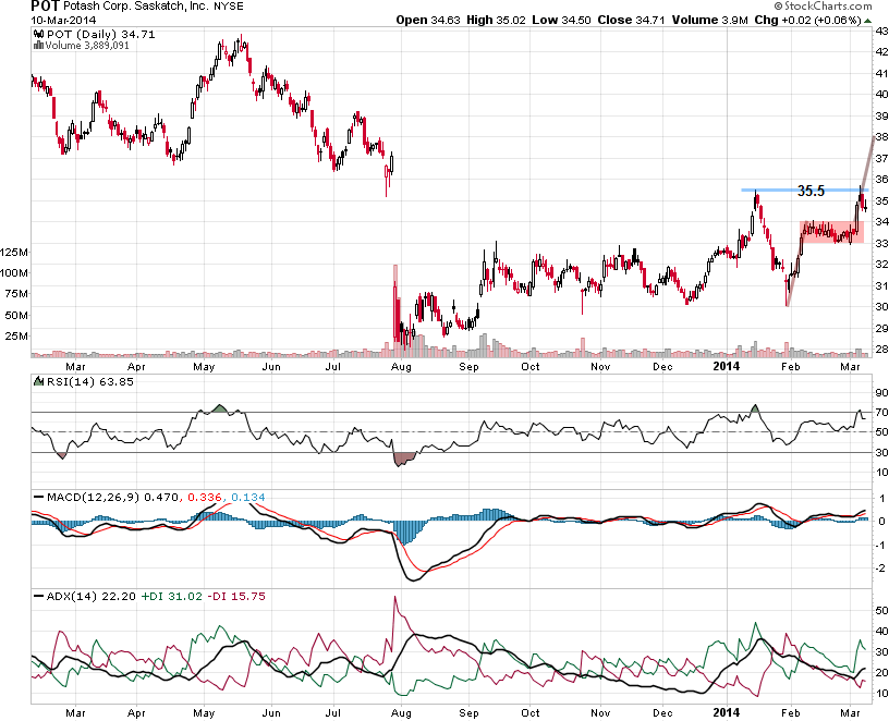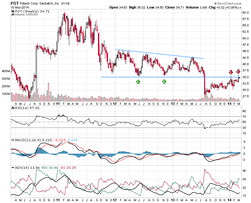 מניית פוטאש נסחרה במגמה שלילית מאוגוסט האחרון בו נודע על פרישתה של אורלקלי הרוסית משוק האשלג העולמי. המניה שברה את אזור של 35 דולר אזור תמיכה מהותי וחזק מאוד בגרף השבועי וירדה לאזורי שפל סמוך ל 28 דולר.