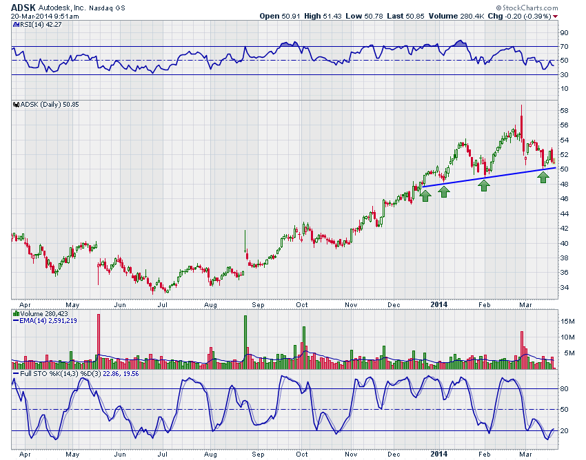 מניית אוטודסק נסקה בכ- 66% מהשפל שנרשם בתחילת חודש יולי 2013 ועד לשיא שנרשם במהלך חודש פברואר (במונחי שערי סגירה). בתאריך 27/02 המניה זינקה בתחילת המסחר לשיא חדש ונגעה במהלך המסחר ברמה של 58.68 דולר, אולם חתמה את יום המסחר בירידה ברמה של 54.28 דולר. בפועל נוצר נר היפוך דומיננטי ראשון. עד היום המניה לא הצליחה להתאושש והתבנית המתהווה בגרף המחירים הפכה לדובית.
