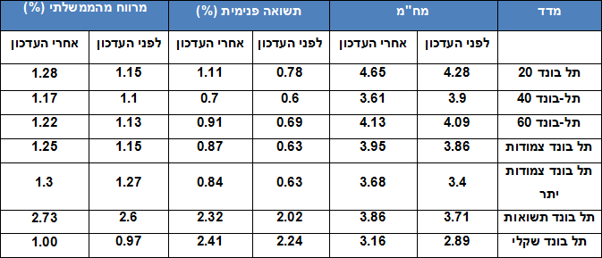 להלן השינויים הצפויים בפרמטרים של מח"מ, תשואה פנימית ומרווח התשואה מעל האג"ח הממשלתי המקביל במדדים העיקריים: