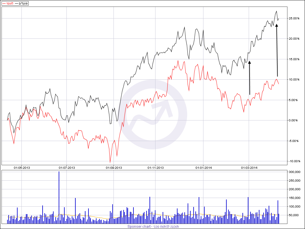 מניית לאומי סובלת מחולשה מתחילת חודש מרץ האחרון, בעוד מניית בנק הפועלים, הבנק בעל שווי השוק הגדול בישראל ממשיך לכבוש שיאים חדשים, מניית בנק לאומי מדשדשת מאחור עם ביצועי חסר ונמצאת רחוקה כ 5.5% משיאה השנתי סביב 1450 נקודות. הפערים הקיימים ממשיכים להיפתח ב 12 החודשים האחרונים בעוד מניית הפועלים משיגה תשואה נאה של כ 25 אחוז, מניית בנק לאומי עם ביצועי חסר של פחות מ 10%.