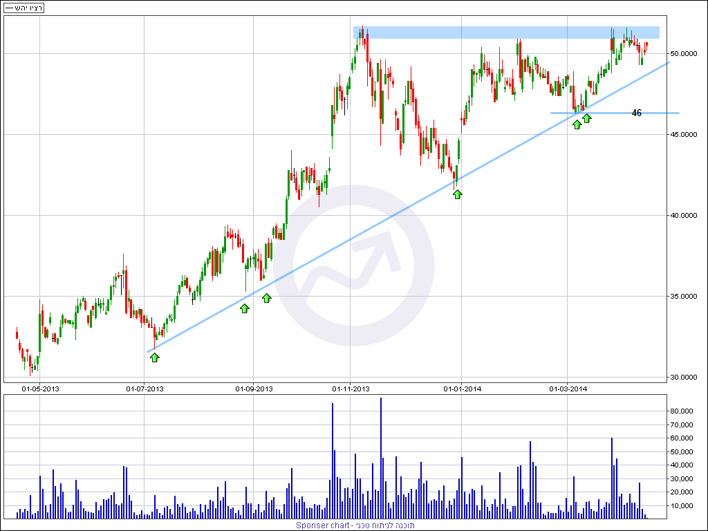 בגרף היומי ניתן לראות את ההתכנסות של החודשים האחרונים כלפי מעלה, אזור התנגדות נמצא ברצועה של 51-52 אגורות ומנגד אזור תמיכה מעל קו מגמה עולה כשהקרוב נמצא ברמה של 49 אגורות הוא השפל האחרון והשני באזור של 46 אגורות שהוא השפל הברור יותר על הגרף, כך שגם אם ישבר קו המגמה העולה מבנה המחירים עדיין יישאר חיובי על עוד אנו מעל שפל זה.