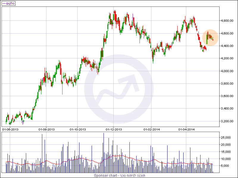 גם במקרה של מניית סלקום הדשדוש הנוכחי מהווה תקופת מעבר בהמתנה לטריגר חיובי שיוציא את המניה מהדשדוש למהלך עליות מחודש. הטריגר האמין יתקבל בפריצה כלפי מעל השל רף ה- 4,600 נקודות עם מחיר יעד ראשון ב- 4,830 נקודות ולאחריו המבחן ברמת השיא סביב 4950 נקודות. התבנית הנוכחית בתוקף כל עוד המניה נסחרת מעל רף ה- 4,400 במונחי שער סגירה