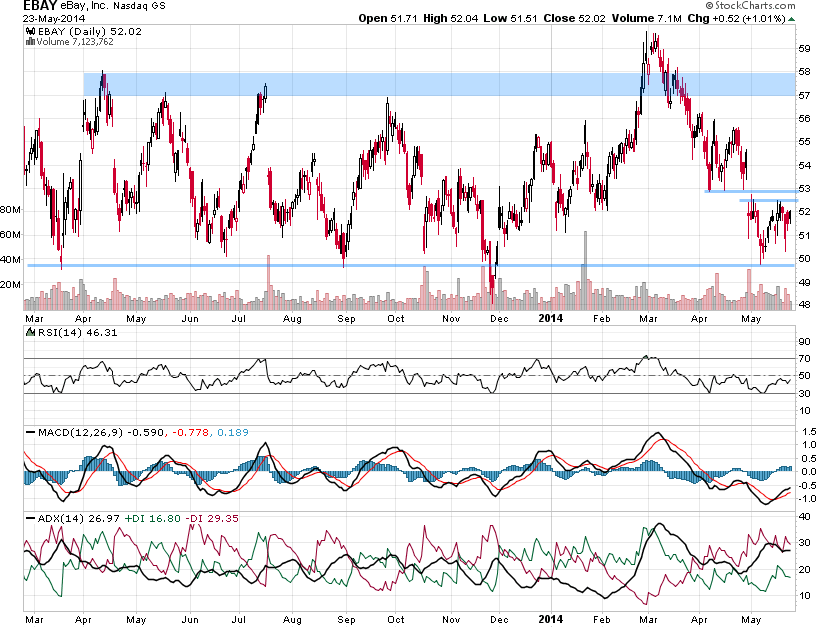 המניה נסחרת בתנועה רוחבית כבר מספר רב של חודשים, טווח המסחר ברור מאוד אזור של 57.5 התנגדות מול תמיכה סביב 50-49.5 דולר. במהלך התקופה התבצעה שבירת שווא אחת כשהמניה חזרה מעל לתמיכה לאחר יומיים ופריצת שווא אחת בסיום חודש פברואר השנה.