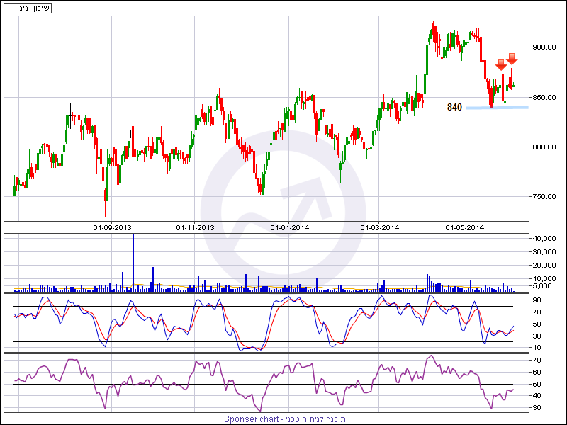 הנחת עבודה – רף ה- 840 מהווה רמת תמיכה חשובה לטווח הקצר בעוד הטווח 870-880 מהווה אזור התנגדות. בשלב זה, בשל התצורה הדובית המתגבשת בגרף היומי אזור 840 מהווה רמה קריטית להמשך יומה של המגמה החיובית בטווח הקצר לכן שבירתה כלפי מטה תוציא מהלך יורד המשכי. במידה ואכן המניה תסגור מתחת לרמה זו, מחיר היעד של התבנית הנוכחית סומן ב- 780 נקודות.