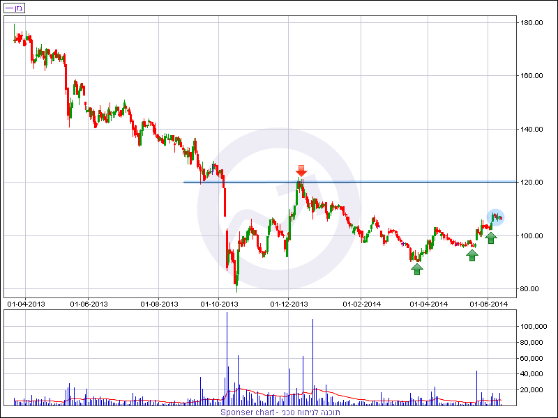 הנחת עבודה – פריצה כלפי מעלה של אזור 107.6-108 תהווה טריגר חיובי חדש ותאשרר את המגמה החיובית המתגבשת בנייר. מחיר היעד הנוכחי סומן ברמה של 120 נקודות ובמידה ותכבוש את מחיר יעד זה, תושלם גם תבנית ההתבססות הארוכה לאחר מגמה דובית ארוכה שנמתחה על פני שנת 2013. כמובן שהדרך עוד ארוכה, אולם התצורה המתהווה בגרף המחירים הינה חיובית ותומכת בהמשך תיקון עולה בטווח זמן הקצר אל עבר מחיר היעד.