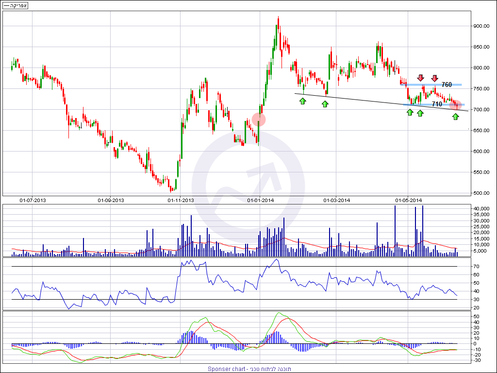 מצד אחד, ניתן לראות בגרף שהמניה סיימה את יום המסחר מעל רמת מחיר עגולה של 700 נקודות ומעל קו תמיכה אלכסוני שזוהי הנגיעה הרביעית בו. מצד שני, המניה דבר שפל אחרון סביב 710 נקודות ולכן מבנה המחירים הינו יורד לטווח הקצר.