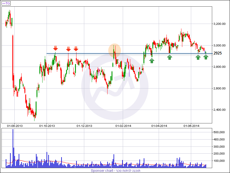 מהזווית הטכנית, המניה נסחרת היום, נכון לזמן כתיבת שורות אלו, מעל רף 2,925 נקודות המהווה רף תחתון של טווח הדשדוש הנוכחי ורמת תמיכה אופקית מהותית. רמה זו בלמה את העליות בתקופה מחודש אוקטובר 2013 ועד חודש מרץ האחרון, למעט פריצת שווא אחת. מאז המניה נסחרת מעל רמת התמיכה האופקית ובלמה את הירידות 3 פעמים, לא כולל ההיפוך שנרשם היום.