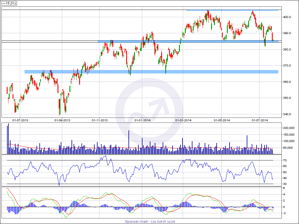 בגרף היומי ניתן לראות את טווח המסחר בארבעת החודשים האחרונים, אזורי שיא רב שנתיים סביב 405 נקודות ואזור תמיכה חזק סביב 384/5 נקודות. המימושים האחרונים בשוק הביאו את המדד פעמים לאזורי התמיכה. פעם אחת לפני כשבועיים בתחילת המבצע צוק איתן ופעם שנייה אתמול בפתיחת שבוע המסחר.