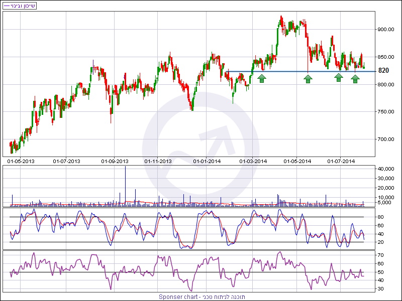 מניית שיכון ובינוי מדשדשת כחודשיים מעל רמת תמיכה חשובה. קודם לכן המניה נסחרה ברמת שיא סביב 916 נקודות. מתחילת השנה המניה לא הניבה תשואה, בהתאם למדד הנדל"ן בו היא נכללת (10.6% מהמדד).
