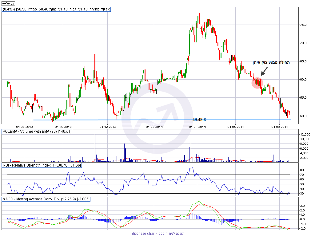 מהבחינה הטכנית מצב המניה לא היה טוב גם בלי מבצע צוק איתן. מניות החברה נסחרו לפני המבצע ברמות מחיר של 58-60 אגורות למניה בתחילת יולי כשהמחיר של המניה יורד מרמות שיא שלא נראו מלפני 2012 סביב מחיר של 76-78 אגורות למניה. בעקבות המבצע והפרסומים על ביטולי הזמנות של תיירים כמו גם ביטולי הטיסות של החברות הזרות לפרק זמן של 48 שעות, התדרדרה המניה עוד במורד הגרף ונעצרה בשבוע שעבר סביב אזור תמיכה חזק מאוד מעט מתחת ל 50 אגורות.