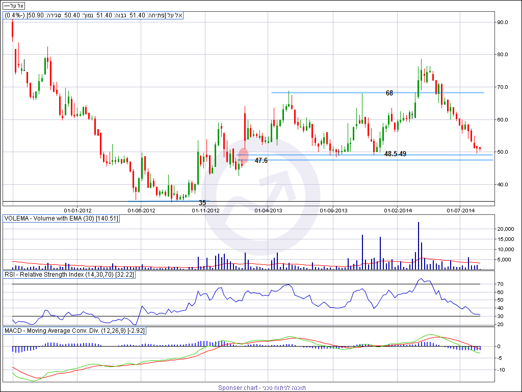 טכנית, ניתן לראות שמניות החברה נסחרות כבר שנה וחצי בריינג ברור מאוד לפחות מבחינת רמת התמיכה שנמצאת סביב 48.4-50 אגורות למניה. לראשונה מאז דצמבר שנה שעברה, שבא המניה לאזורי התמיכה (כפי שניתן לראות בגרף המצורף לסקירה) אולם עדיין לא קיימת עצירה במחיר. פער מחירים פתוח (גאפ) שקיים גם בגרף השבועי (נדיר) וגם בגרף היומי סביר שייסגר מתישהו. סגירת הפער תעשה במחיר של 47.6 אגורות למניה. טכנית אזורי תמיכה חזקים בגרף שבועי ויומי יחד עם אינדיקטורים ברמות נמוכות יחסית יכולים להזמין היפוך במניה.