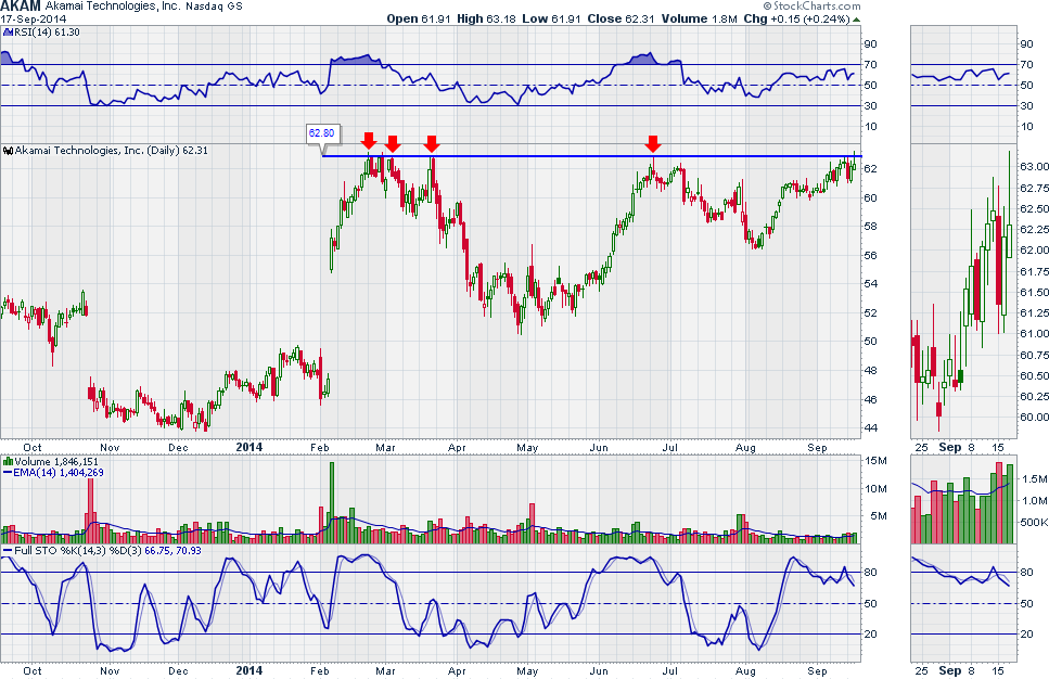 בשבועיים האחרונים המניה "נדבקת" לרף ההתנגדות העליון אשר מהווה התנגדות מהותית שטרם נפרצה. סטטיסטית ככל שיש יותר ניסיונות פריצה/שבירה, לבסוף מתקבלת הכרעה בהתאם למגמת הנייר. במקרה של אקמאי ההנחה היא שהמניה תפרוץ את ההתנגדות ותרשום שיאים חדשים. התבנית הנוכחית הינה "תקרה משולשת" יתכן ותרשום מימוש קצר ולאחר מכן תתקוף פעם רביעית את ההתנגדות, אולם קשה להעריך מתי תפרוץ ולכן יש לעקוב.