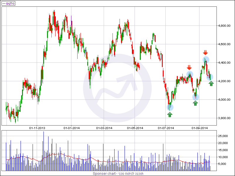 מניית סלקום נסחרת מתחילת השנה בתשואה שלילית של כ- 10%. מתחילת חודש יולי המניה התאוששה ורשמה תיקון עולה של כ- 8% מהשפל שנרשם בסוף חודש יוני האחרון סביב 3,960 נקודות. במהלך תקופה זו המניה רשמה 2 שיאים עולים ושפל עולה אחד, קרי מבנה של מגמה עולה קלאסית.