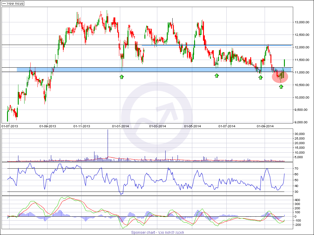 המניה חזרה בסיום שבוע המסחר הקודם מעל רמה של 11000 נקודות בהתאם לתבנית הטכנית שהתהוותה במניה. למרות שנעלה את שבוע המסחר הקודם מתחת לרמה של 11200 נקודות הנעילה השבועית מעל 11000 נקודות וברצועת התמיכה החזקה הייתה רמז חיובי ראשוני. נראה שכל האזור שבו נסחרה המניה בשבוע המסחר הקודם הינו אזור תמיכתי וחזק מאוד, כך שלמרות שנסחרה מתחת לרמה של 11000 בשבועיים האחרונים לא ראינו מוכרים נחושים, אלא להיפך, נרות ירוקים ובלימה סביב מחיר 10700-11000 ששוב יכולים להחזיר את המניה לתוך טווח המסחר ולמהלך עולה בשבוע-שבועיים הקרובים.
