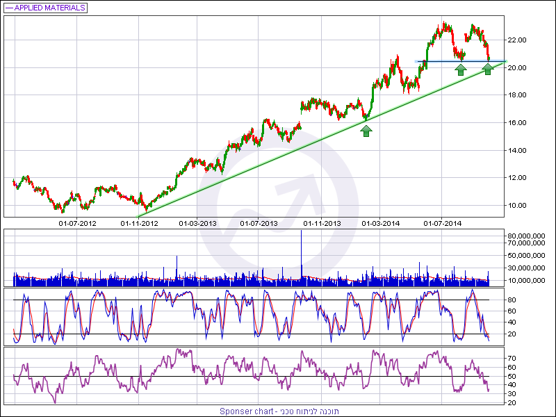 עם תשואה חיובית של כ- 20% מתחילת שנת 2014, מניית אפלייד מטיריאלס מתמודדת עם אזור תמיכה מהותי לטווח זמן קצר-בינוני סביב 20-20.5 דולר. מצד אחד, מדובר בשילוב של קו מגמה ארוך טווח ורמת תמיכה אופקית אשר תמכה בנייר בחודש אוגוסט. מנגד, התקרה הכפולה שנרשמה בתחילת חודש ספטמבר על רמת השיא השנתי סביב 23.2 דולר עשוי לשמש כבסיס לתבנית מימוש מסוג M.