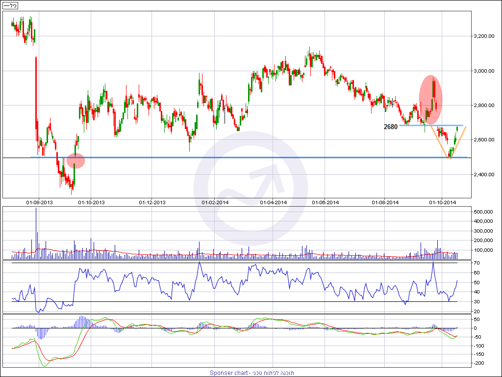 בגרף היומי, ניתן לראות את אזור הבלימה במחיר סביב 2500 נקודות, אותו אזור הביא לגאפ עולה בדיוק לפני כשנה והוציא את המניה מרמות שפל רב שנתיות. אותן רמות שפלהגיעו בלל יציאה של אורלקלי מקרטל האשלג שעורר אז המון כותרות ושלחה את כיל ומניות גלובליות נוספות מהסקטור שלה לירידות שערים חדות.