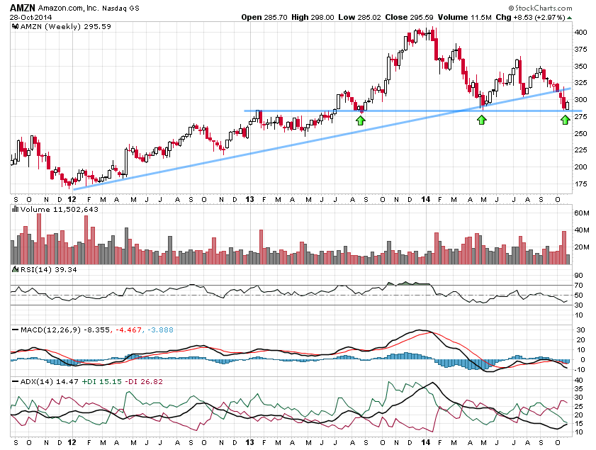 הגרף השבועי המצורף לסקירה מראה את אזור התמיכה בצורה ברורה מאוד, אזור של 285 דולר הינו אזור השיא של תחילת 2013, שפריצתו והתבססות מעליו הביא את המניה למבואות 400 דולר. עוד ניתן לראות שקו מגמה עולה נשבר בירידות האחרונות של המניה וזהו למעשה איתות שלילי ראשוני בנוסף לאינדיקטורים שעוברים לטריטוריה שלילית בגרף הארוך.