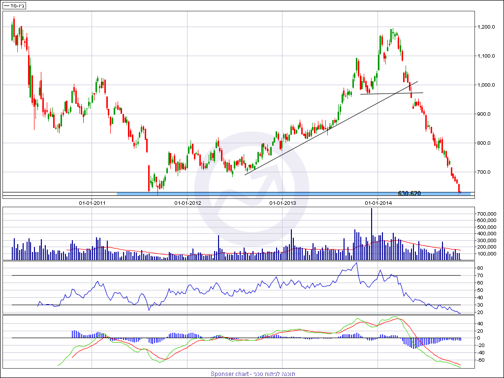 הגרף השבועי ממחיש היטב את המגמה השלילית וירידות השערים החדות שעברו על המדד בחודשים האחרונים. נזכיר, שהמדד פתח את השנה במגמה חיובית והספיק לעלות קרוב ל 20% מרמות פתיחת השנה ועד לאזורי השיא שסמוכים לרמות המחירים בו צוטט המדד לראשונה. החל מסיום חודש מרץ החלו להופיע מוכרים על הגרף ואלה מופיעים עד לכתיבת שורות אלה כשהם שולחים את המדד ללא עצירות אל עבר רמות השפל שלו משנת 2011. טכנית סוחרים אגרסיביים יכולים להמתין להיפוך מגמה סביב הרמות האלה כדי לחבור למדד שירד בחדות. אולם לאחר ביצועי הנפל של החברות שחלקן ככל הנראה הגיעו לשיווי שפשוט אינו מוצדק רצוי להיות זהירים עם קניה רוחבית של המדד.