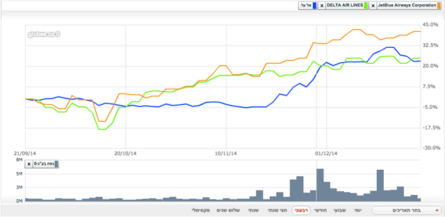 ב- 3 השנים האחרונות מניית דלתא איירלינס נסקה ב469%. לעומתה, מניית חברת התעופה האמריקאית ג’ט בלו )שחברה לאלעל לאחרונה) הסתפקה בעליה של 188% ואילו אלעל במהלך 3 השנים האחרונות עלתה ב8% בלבד.
