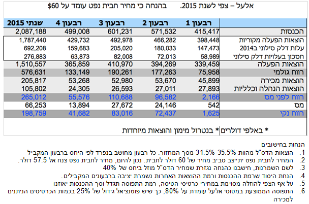 לצורך תחשיב צפי דוחות אל על לשנת 2015, הנחתי כי רמת ההכנסות וההוצאות נשארת יציבה ורק את השינוי בהוצאות הדס"ל בודדתי חישבתי את ההשפעה בהנחה כי מחיר חבית נפט יהיה בממוצע $60 בשל ירידת מחירי הנפט, צפויים להיות שלל הנחות ומבצעים שיורידו את רמת מחירי הכרטיסים, ומאידך יעלו את כמות הכרטיסים הנמכרים ואת התפוסה במטוסים העומדת כיום במטוסי החברה על 80% בלבד. כך שסך ההכנסות ישמור על יציבות.