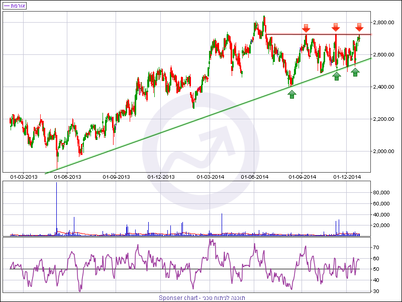 הנחת עבודה - אזור 2,725 נקודות מהווה התנגדות אופקית וגבול עליון של הדשדוש הנוכחי. מלמעלה רף השיא שנתי ב- 2,839 נקודות מהווה התנגדות נקודתית (פסיכולוגית בעיקרה). על בסיס פרמטרים אלו, פריצה של 2,725 נקודות כלפי מעלה והתבססות מעליה תהווה טריגר חיובי לתחילת גל עולה חדש עם מחיר יעד ברמה של 2,950 נקודות, בתנאי שהשיא השנתי לא יבלום את המהלך.