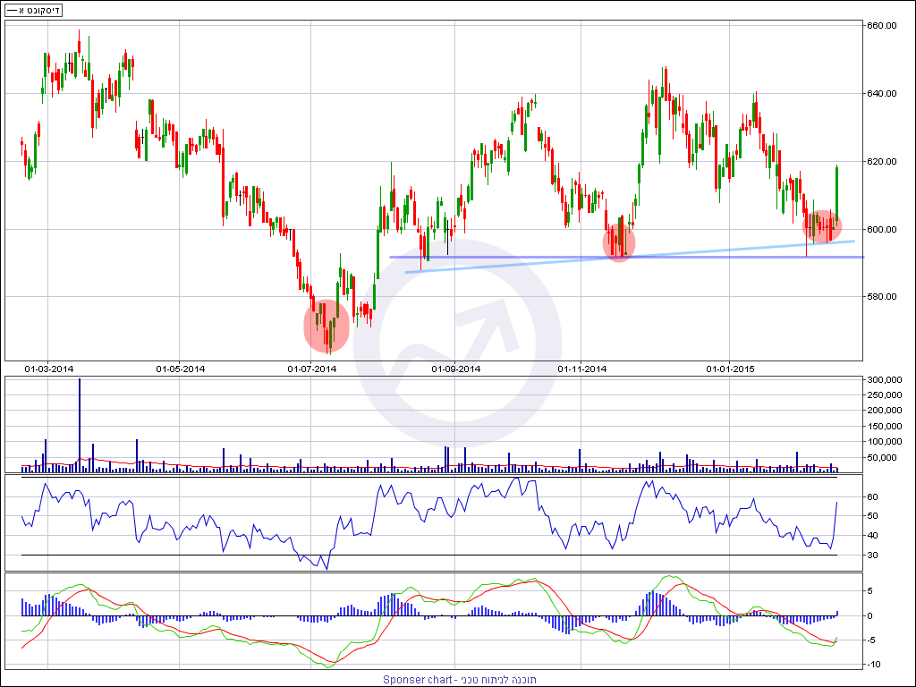 המניה נכנסה לפוקוס בסקירה השבועית האחרונה (מדור ניתוח מניות), המהלך העולה שהגיע היום במניות הסקטור בחסות המהלך החזק בשוק לא הייתה צריכה להפתיע. המניה התהפכה שוב מאזור תמיכה חזק ברצועה של 590/600 נקודות ויצאה למהלך עולה. רוב ההיפוכים במניית דיסקונט סביב רמות תמיכה מתרחשים במשך מספר ימים לאחר מהלכים יורדים וכך קרה גם הפעם.