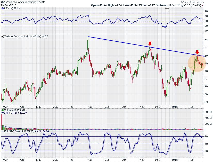 מניית ורייזון עלתה מתחילת השנה ב- 5.5% ורחוקה מהשיא בכ- 5%. הזינוק במחיר המניה החל בתחילת החודש ועצר בלפני מספר ימים, מאז המניה נסוגה חזרה, אולם במתינות ובתנודתיות נמוכה יחסית. בשני ימי המסחר שחלפו המניה רשמה התבססות מעל 48.5 דולר, הגבוה האחרון שנרשם במהלך חודש ינואר. מהתמונה הכללית נראה שהמניה מתבססת מעל הגבוה האחרון ומייצרת שיאים ושפלים עולים בטווח זמן הקצר. תצורה זו מגדילה את האפשרות להמשך המהלך העולה בנייר.