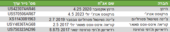 היינץ – ראשונה ברשימה היא אג"ח מענקית המזון האמריקאית היינץ. החברה שנוסדה ב-1888 היא אחת מיצרניות מוצרי המזון הגדולות בעולם הפועלת בשש יבשות ומוכרת ל-200 מדינות. וורן באפט רכש את השליטה בחברה ב-2013 ובחודש שעבר נחתם הסכם בין היינץ לבין ענקית המזון קראפט למיזוג בין השתיים. עסקה זו תיצור קונגלומרט מזון עם מכירות של כ-28 מיליארד דולר בשנה. בעלי המניות של קראפט יקבלו 10 מיליארד דולר במזומן ו-49% מהחברה הממוזגת. לתיק הישראלי נכנסה הסדרה שנפרעת באוקטובר 2020 נושאת קופון של 4.25%.