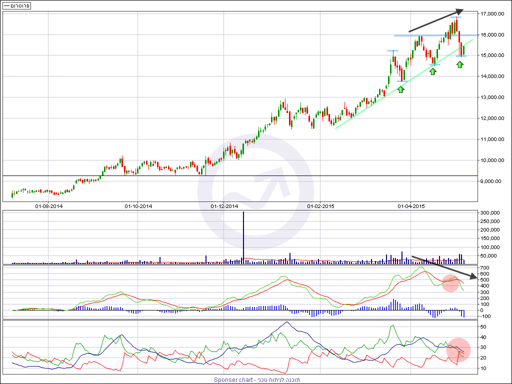 מניית פרוטרום ממשיכה במגמה החיובית שלה בשנים האחרונות והטרנד החיובי במניה ממשיך להיות חזק מאוד כשהמגמה העולה עדיין נשמרת. בחודש וחצי האחרונים התנהגות המניה השתנתה וזה לא לטובה. התנודתיות במניה עלתה באופן משמעותי מאוד וניתן לראות שהגלים היורדים והעולים מתרחשים בתנודתיות גבוהה מאוד שלא אפיינה את המניה עד לשבוע האחרון של חודש מרץ.