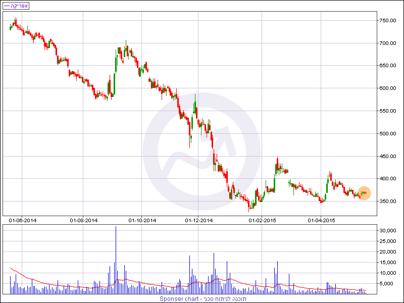 מהזווית הטכנית, מניית אפריקה מדשדשת כבר תקופה ארוכה לאחר גל ירידות חד ומתמשך. נראה כי הדשדוש הנוכחי לא יסתיים בקרוב, אולם בטווח הקצר קיימת אפשרות לתיקון עולה במחיר המניה בהתבסס על תצורת גרף המחירים של החודש האחרון.