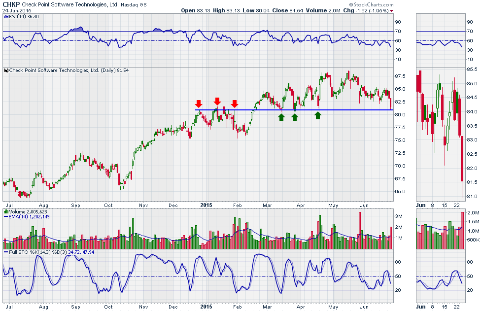 צ’ק פוינט (סימבול: CHKP)– העוסקת בפיתוח תוכנה לאבטחת מידע, ואבטחת רשתות ומחשבים ומוכרת בעיקר בפיתוח תוכנות חומת אש. מניות החברה נכללות במדד הנאסד"ק 100ונסחרת לפי שווי שוק של 14.75 מיליארד דולר.