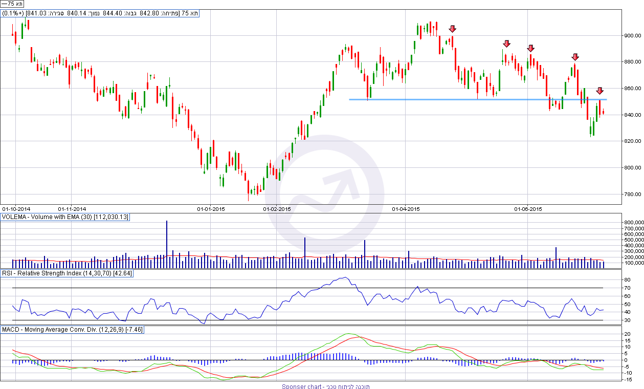 בסקירה האחרונה על מדד הנדל"ן ציינתי כי רמת תמיכה זו של תיקון פיבונאצ’י 61.8 בשילוב אזור אופקי במדד, הביא לתיקון עולה נאה בחצי השני של השבוע שעבר ועד אתמול. האם גם במדד 75 נקבל תמונה דומה? שבירה של השפל משבוע שעבר ברמה של 825 נקודות תביא ליעד סביב 790/800 נקודות שהוא יעד התבנית השלילית שקיימת במדד.